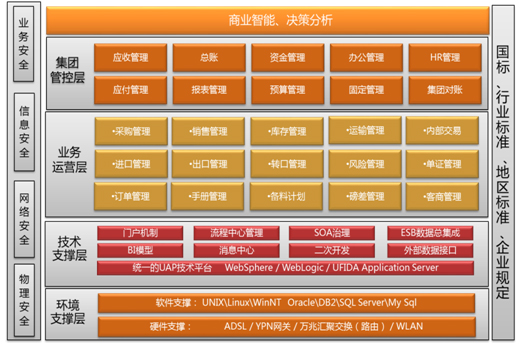 用友贸易行业解决方案立足集团型贸易企业核心应用,以用友UAP平台为基础,实现了集团企业的集中管理、风险内控,精细贸易。应用范围涵盖了外贸进出口管理、内贸供应链管理、财务核算、资金管理、预算管理、人力资源、电子商务、BI等应用,构成了企业全面的信息化管理解决方案。通过集中的业务管理平台,实现贸易过程中的上下游产业链企业、内部企业能够进行全面的业务协同,实现内外贸易协同、业务财务一体化等高度集成应用。